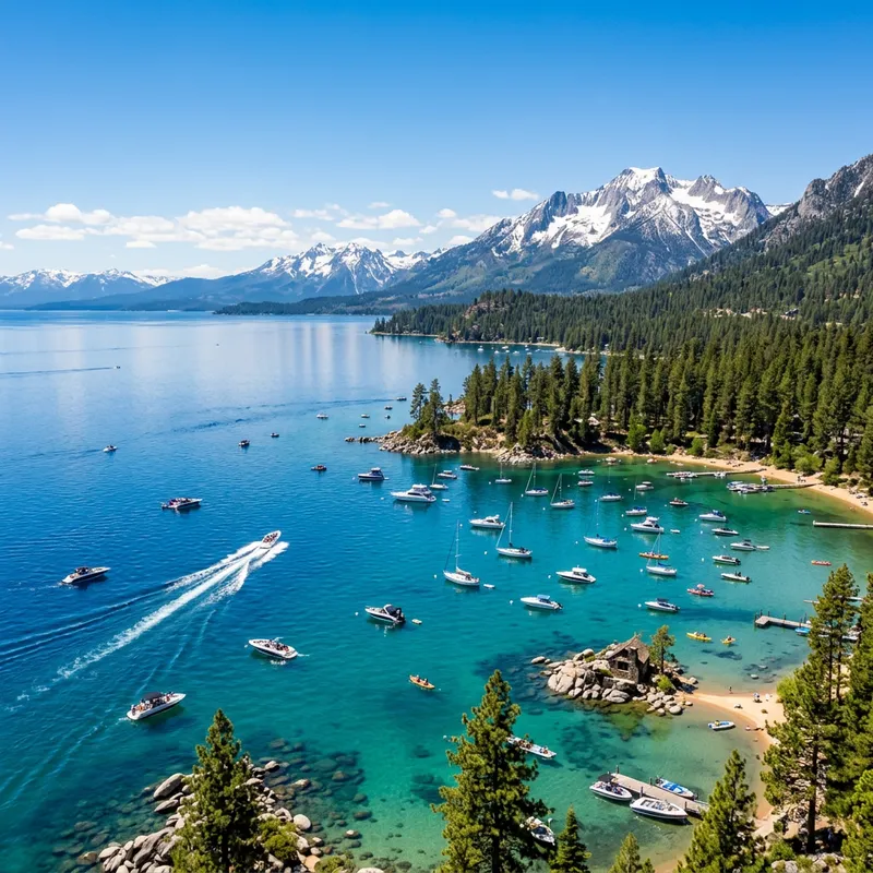 An image that captures the asymmetrical balance of Lake Tahoe. The water in the lake is emerald and cobalt blue, reflecting the crisp, clear sky above. It's a sunny day, with light clouds adorning the horizon. There are boats of various sizes and shapes scattered about the lake, adding to the scene's unique aesthetic. Some boats are powered by motors and leave a trail of stirred water in their wake, while others are still and calm in the water, basking in the sunlight. Majestic, snow-covered mountain peaks rise in the background, illustrating the lake's breathtaking natural beauty.