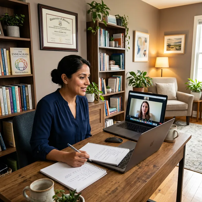 Illustrate a scene of a psychologist's office. The room should be unisex and professionally decorated, signifying that this is a space where advice and guidance are offered. A female psychologist around 35 years old, of South Asian descent, should be depicted sitting at her desk, interacting with a patient via a video call on a laptop screen. Documenting the session, you can see a notebook and a pen next to the laptop. The psychologist appears firm, empathetic and is visibly engaged in the conversation. There is a diploma on the wall indicating her education in psychoanalysis and a book about the enneagram on her shelves.