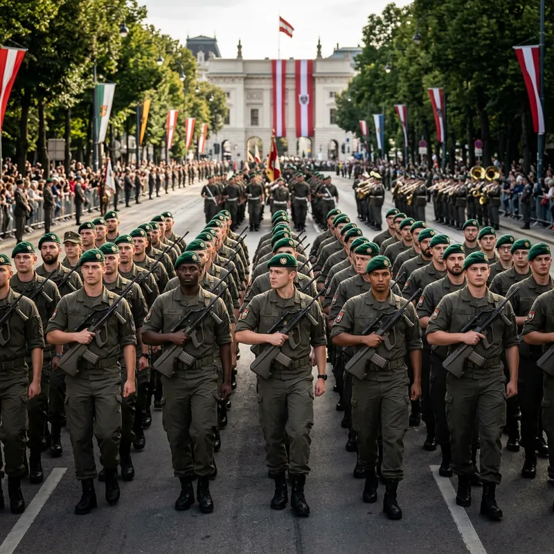 A wide-angle lens photograph showcasing Austrian soldiers, diverse in gender and descent, participating in a military parade. The image, captured with a high-speed shutter, accentuates the precision and discipline of these armed forces. Utilizing dramatic lighting and shadow play, their patriotic and heroic poses stand out prominently. The grandeur of the event, from the orderly arrangement of the troops to the commanding atmosphere, is military-inspired and full of dynamic energy.