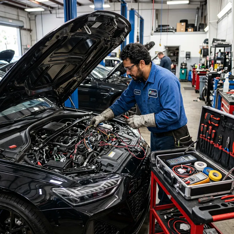 Depict an auto electrician of Hispanic descent, wearing a blue work uniform with protective gloves, intricately working on the wiring system of a high-end, glossy black sports sedan. His toolbox filled with various specialized tools is neatly placed beside him. The car resembles a high-end performance vehicle but without specific brand logos. The setting is a well-lit car repair workshop.