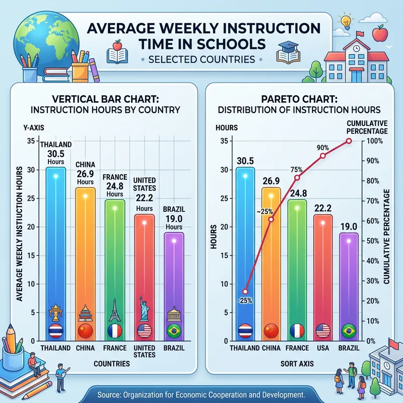 Create an illustrative vertical bar chart and a Pareto chart. The charts should highlight the average weekly instruction time in schools for five selected countries. The countries and their respective instruction times are, Thailand with 30.5 hours, China with 26.9 hours, France with 24.8 hours, the United States with 22.2 hours, and finally, Brazil with 19 hours. The chart should be precise, easy to read, and each country should be represented by different color bars. Along with the charts, include the source of the info as text at the bottom: 'Source: Organization for Economic Cooperation and Development.'