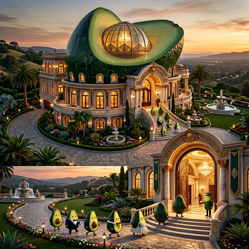 An elegant avocado-shaped mansion with a lot of wealth embodied in its structure. Underneath, in a smaller scale, depict six avocados entering the grandiose mansion.