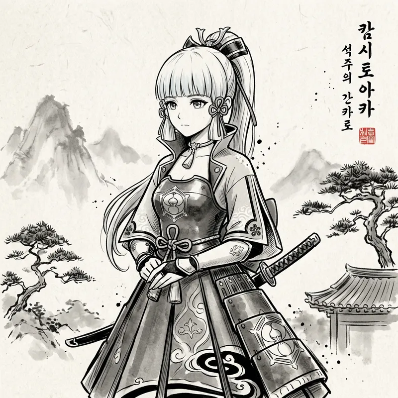 Ayaka, a character from a popular role-playing game, depicted in the refined, monochrome drawing style of traditional Korean manhwa. Her signature hair color, facial features, and physique, as seen in the game, should be clearly represented. She should have an elegant stance, respectful and regal, a spitting image of her in-game character design.