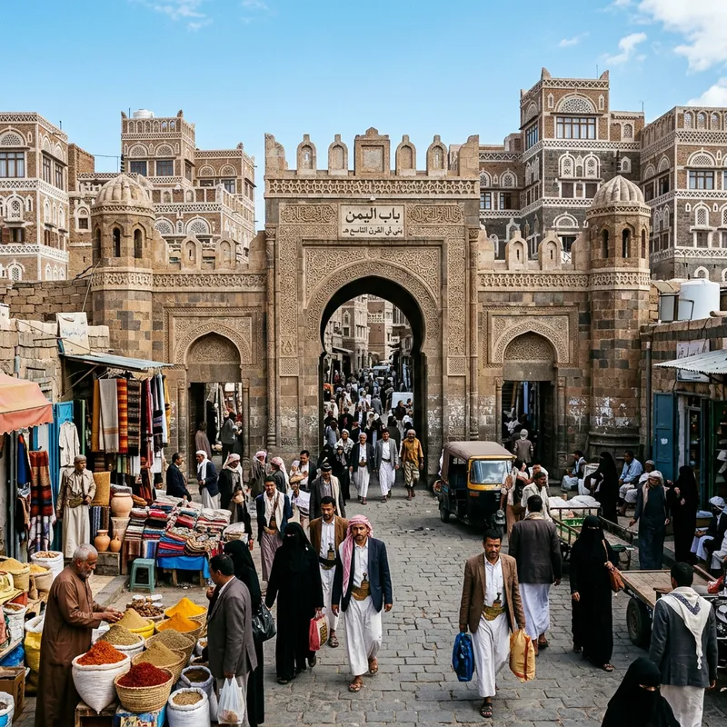 A detailed depiction of Bab al-Yemen, the iconic gateway standing in the old city of Sana'a, Yemen. The gate, with its arched entryway, intricate stone masonry, and ornate arabesque designs is a symbol of the city's historical and cultural heritage. The surrounding scene is full of hustle and bustle, with locals of various descents and genders moving on foot, conducting trade, or conversing in small groups. Some vendors with their colorful stalls selling traditional spices and fabrics are also visible. The sky is a clear blue, with the city's unique, multi-storied buildings forming the backdrop.