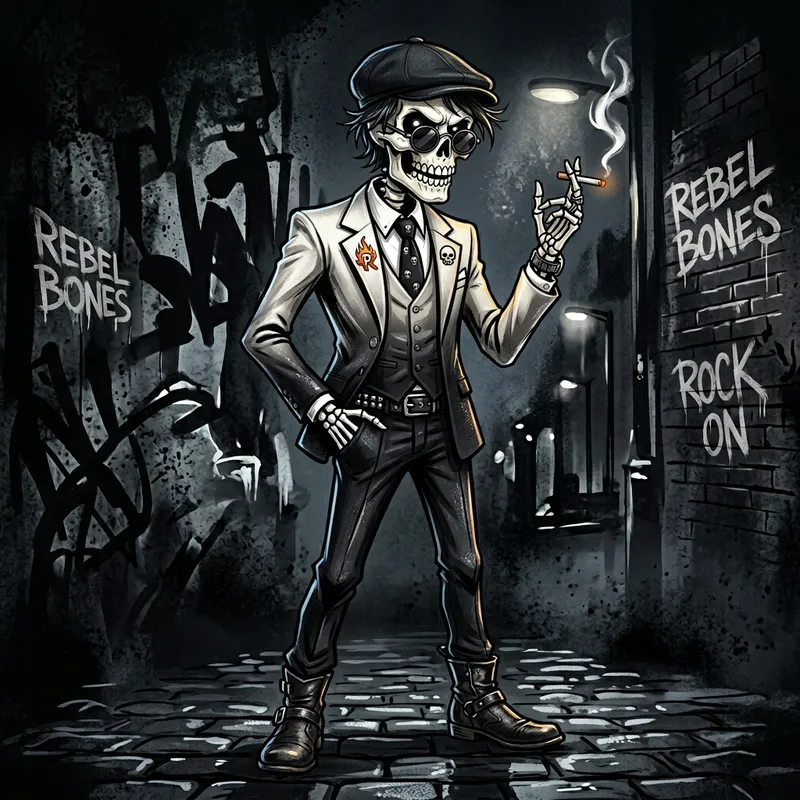 An illustration of a cartoon skeleton exuding a sense of rebellion. This skeleton character is outfitted with a finely-tailored suit. Colors morph from the more traditional bone white to stark blacks as they form the suit, shimmering with a sense of polished elegance. The backdrop is a deep, dark canvas of ink-black that beautifully contrasts with the skeletal figure, emphasizing its quirky charm.