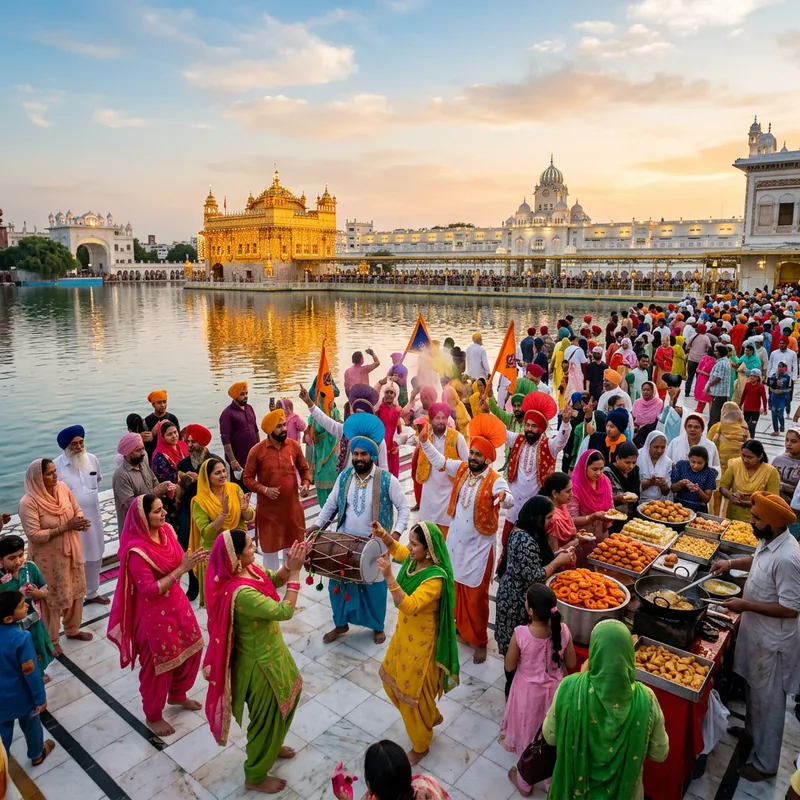 A photo-realistic depiction of the Baisakhi festival which is a significant event in the Sikh religion. The scene includes people of diverse descents and genders joyously participating in the celebrations. Traditional attire like turbans and salwar kameez can be seen. The air is filled with colors and excitement, and the Golden temple in the background symbolizes the religious significance of this event. The sky is blue with a soft glow of the setting sun, reflecting on the serene waters surrounding the temple. Vendors can be seen selling sweets and snacks, adding to the festive mood.