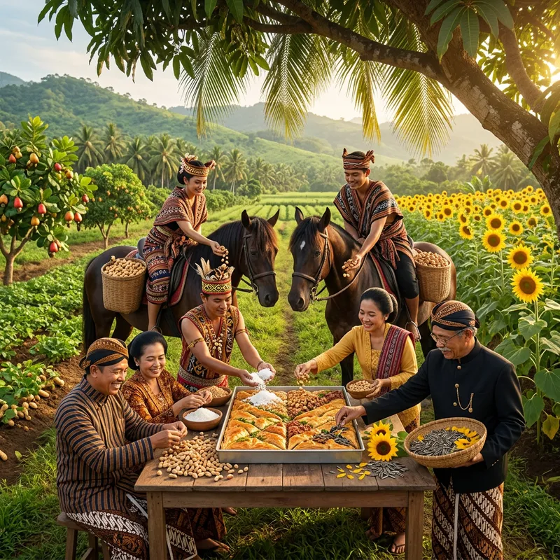 Imagine an enchanting land bathed in the warmth of the sun, where a secretive orchard is tucked between lively coconut groves and rolling hills. In this orchard, a confluence of cultures coexists in harmony. Dayak people of Kalimantan skillfully picking the finest coconuts, a couple from Sumba, draped in intricate attire, harvesting cashews while riding their majestic horses, a Tuban heritage-rich Javanese family joyfully gathering peanuts, and a gentleman from Bandung in Sundanese attire deeply engrossed in a field of sunflower plants. One day, each of these representatives with a shared adoration for nature come together to engage in a culinary journey. The rustling of the coconut palm leaves fills the air as these cultures combine ingredients to carefully craft a unique, multicultural baklava. The air saturates with mouthwatering anticipation, and finally, the Baklava of Harmony is created. A beautiful symbol of unity amidst diversity, this baklava is a testament to the extraordinary things that can happen when different cultures come together, and nature lends its hand.