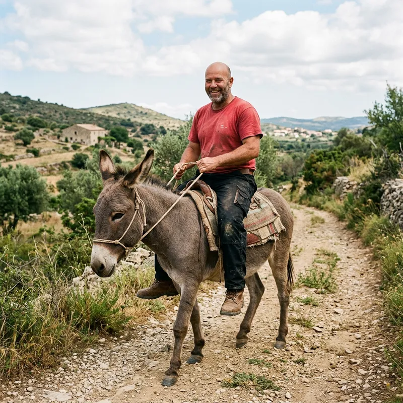 A Bald Man in a Red T-Shirt Rides a Donkey