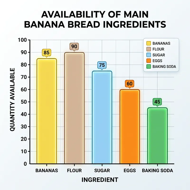 Create an image of a simple bar graph that represents the availability of the main ingredients used in making banana bread. The vertical axis should represent the quantity available, while the horizontal axis should have bars for ingredients such as bananas, flour, sugar, eggs, and baking soda. Use various colors to differentiate each ingredient. Add labels to improve the clarity of the graph.