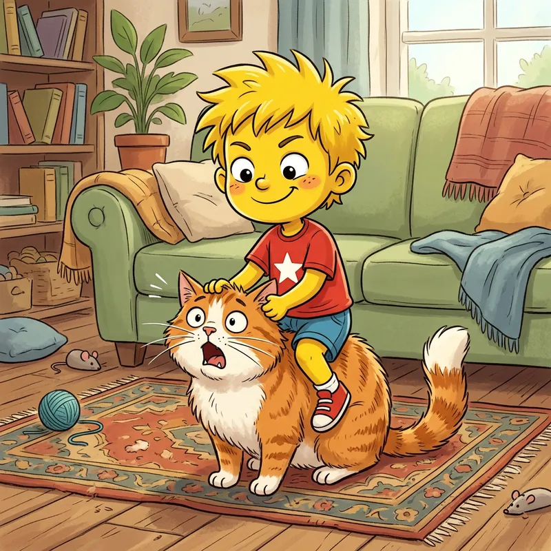 A yellow-skinned, spiky-haired boy sitting on top of a domestic cat, with an innocent expression on his face. The boy is dressed in a red shirt and blue shorts, looking a bit mischievous. The cat, on the other hand, has a surprised look as it wasn't expecting to turn into a vehicle for the little boy. It's a fun, everyday cartoon-like scene.