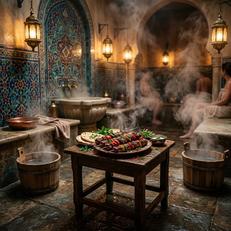 An image of a traditional bathhouse, with its hot stone floor and steam curling up from the wooden buckets filled with hot water. The walls are adorned with mosaic tiles reflecting the soft light from lanterns. In the center of the room, there's a small antique wooden table with a platter of delicious kebabs, their smokey aroma mingling with the warm humidity of the bathhouse.
