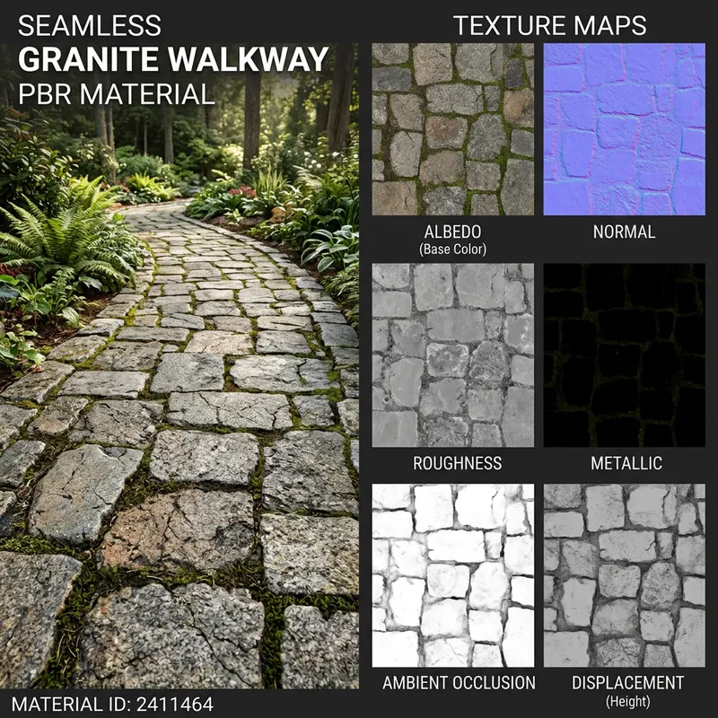 granite stones for walkways, seamless, complete with albedo, normal, roughness, metallic, AO, and displacement, displaying fine cracks and thin moss.