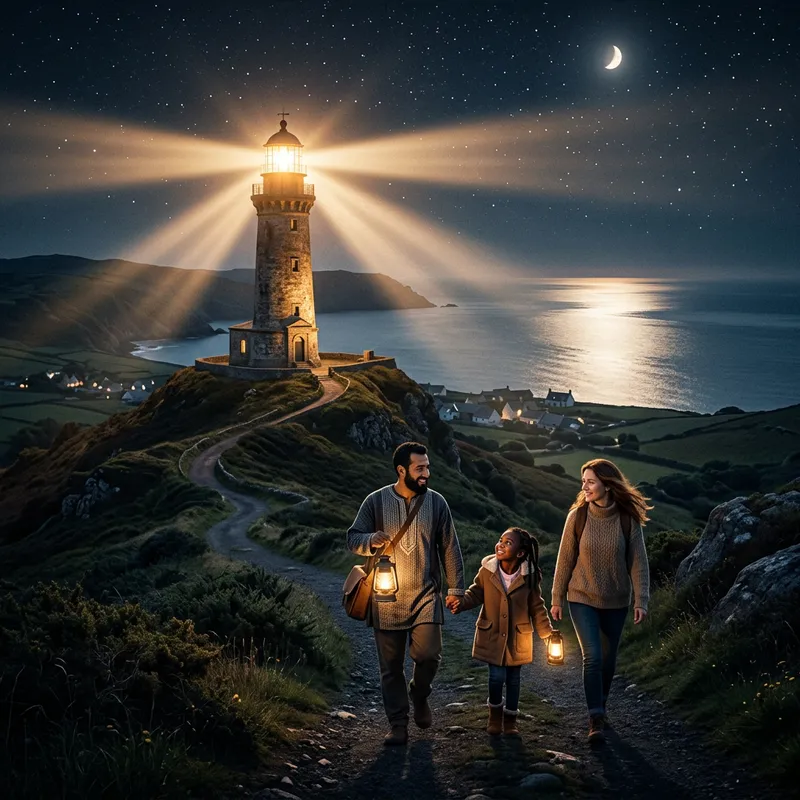 Imagine a beautiful scene where a glowing, radiant beacon stands atop a hill in a tranquil world. This beacon could be a large, timeless lighthouse made of weathered stone, emitting powerful, guiding rays that reach the furthest corners of the earth. The surrounding landscape is serene, bathed in the comforting light of the beacon. Different people - a Caucasian woman, a Middle-Eastern man, and a Black child - are seen walking up the hill towards the beacon, symbolizing unity and a shared aspiration towards this light. Off in the distance, the sea calmly reflects the radiant beacon, and the night sky is dotted with stars, all glowing less brilliantly than the beacon, emphasizing it as the true light of the world.