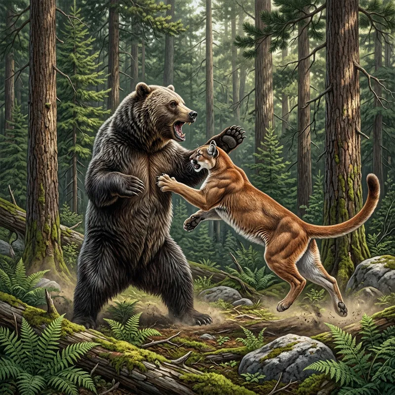A detailed illustration portraying a fierce wildlife encounter, specifically between a grizzly bear and a mountain lion. The scene takes place in a dense forest setting, with towering trees and verdant vegetation. The bear, a massive creature with thick, brown fur and powerful limbs, clashes with the mountain lion, a sleek and agile cat with a tawny coat and sharp claws. Both animals are caught mid-action displaying their physical prowess and survival instincts. Please ensure the image captures the entire scene without any cuts or distortions.