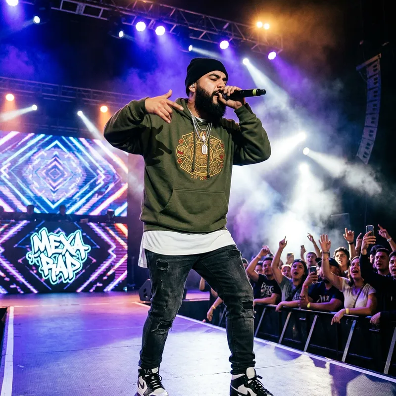A hip-hop artist with a thick beard, showcasing a Mexican descent. He is passionately performing on a brightly lit stage. He is stylishly dressed in a trendy, urban outfit. His hands are rhythmically moving as he spits lyrics into the microphone, showcasing his mastery of wordplay and rhythm. His charismatic stage presence is captivating the hyped crowd beyond him. The surroundings pulsate with the beat of the music, giving a sense of the rapper's high-energy performance.