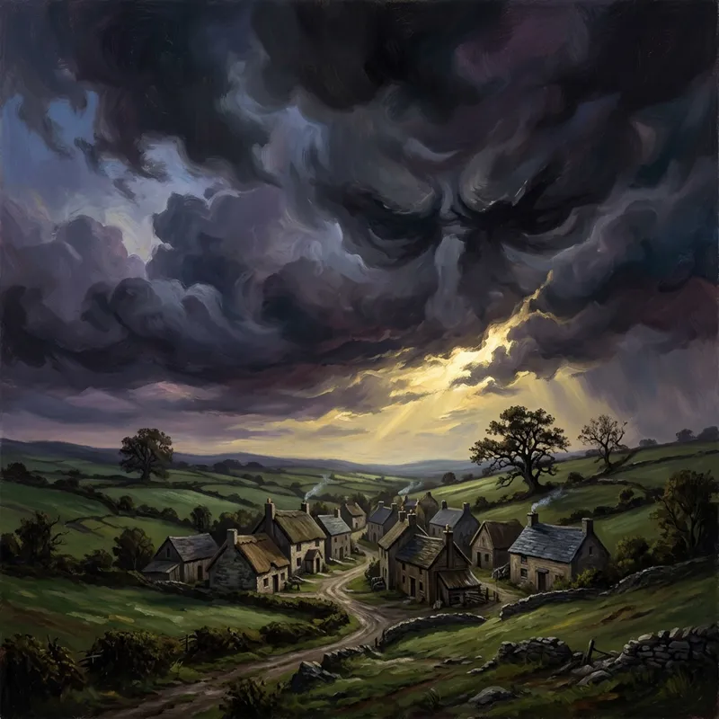 A beautiful countryside landscape portraying a metaphorical depiction of hardship, represented by ominous clouds of power and authority in the sky. The sky is glaring with an expression of disdain and disgust towards the houses populated by its inhabitants.