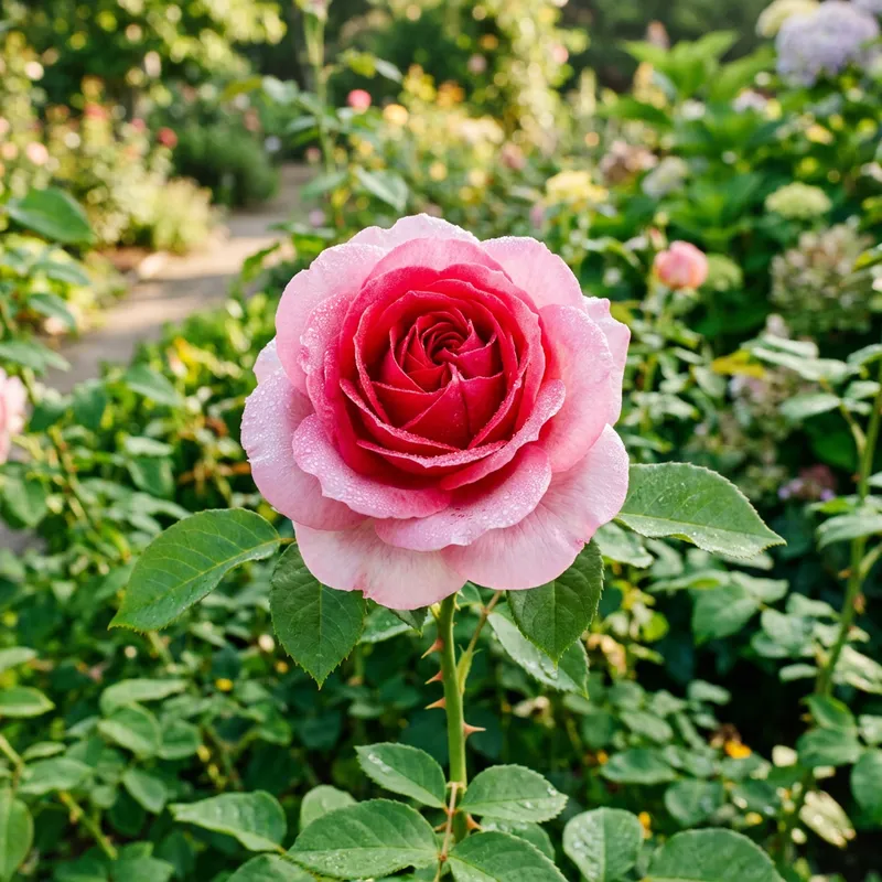 A beautifully bloomed, vibrant and fragrant rose. The petals are lush and full, displaying an enchanting gradient from a brilliant crimson at the bulb to a soft pink at the tips. Dew drops are delicately settled on the petals, reflecting the morning sunlight. The stem is a healthy green and adorned with a few carefully spaced thorns. This rose is surrounded by verdant leaves and it is growing in a well-maintained garden.
