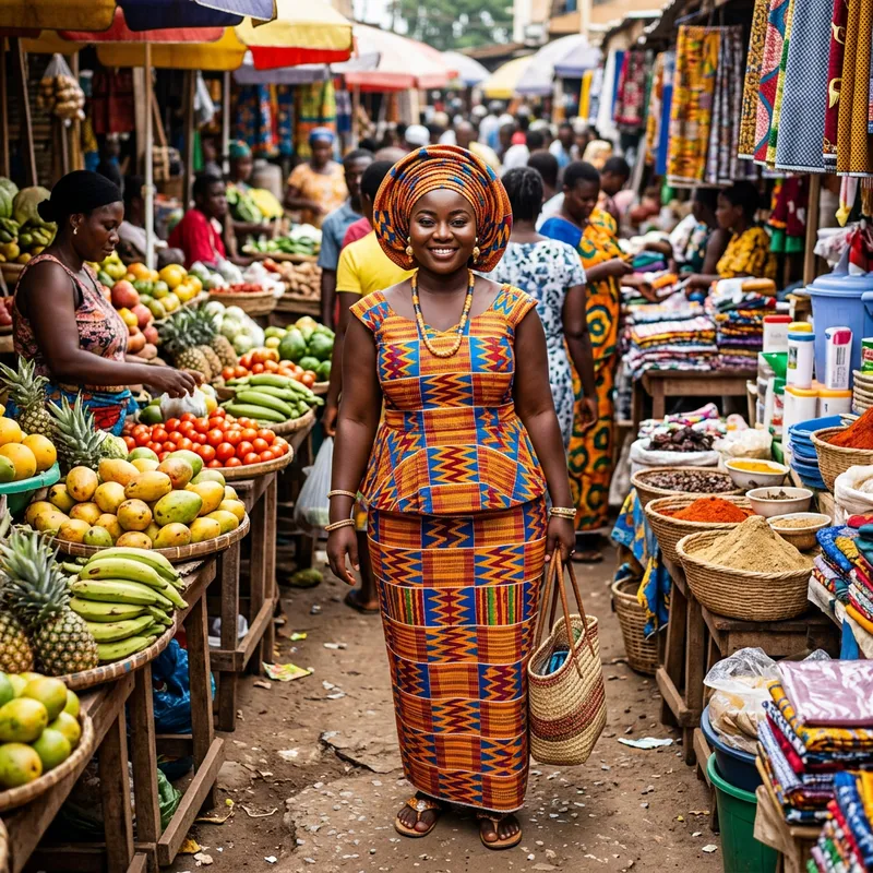 A young Ghanaian woman of dark complexion. She has a short stature and is curvaceous. She is dressed in vibrant traditional Ghanaian attire with intricate patterns. She shows a warm, friendly smile on her face, and her eyes gleam with intelligence. On her head, she wears a matching head wrap that frames her face beautifully. She is in a bustling local Ghanaian market, surrounded by stalls filled with colorful fruits, vegetables, spices, and other goods. People around her are in the process of buying and selling, adding to the vibrant atmosphere.