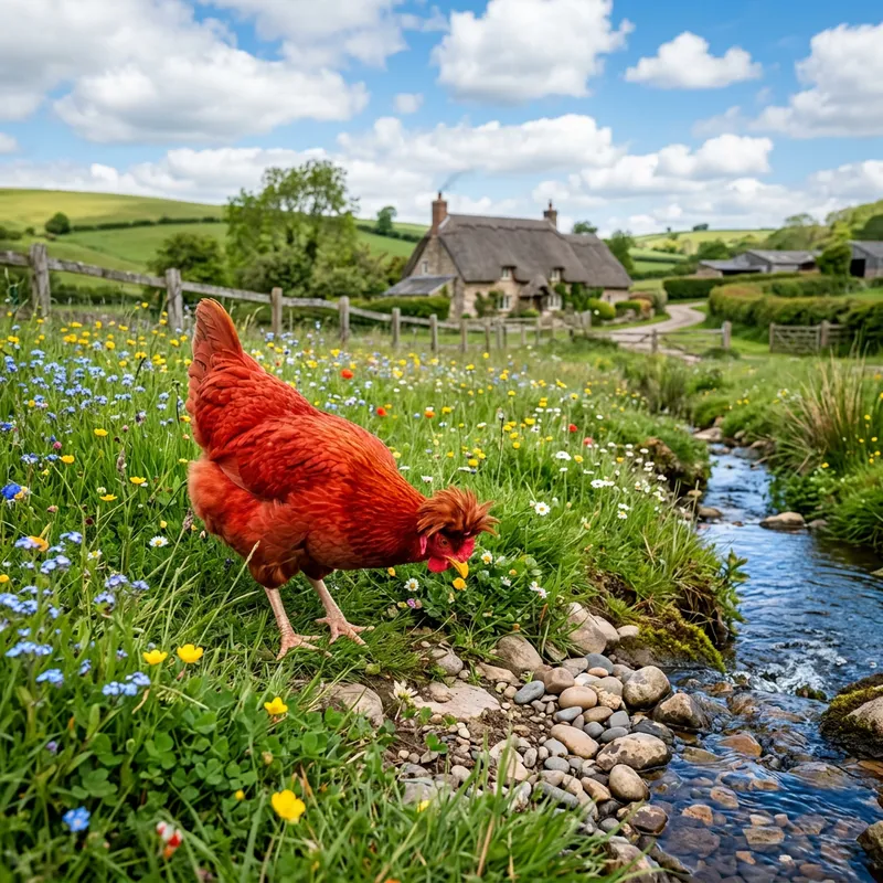 Create an image of a docile chicken wandering about an idyllic countryside setting. It has bright red feathers, a scruffy mop of feathers on its head like a crown, and a yellow beak. Its feet are a pale, dusty peach as it pecks at the ground in search of food. Surrounding it is lush green grass interspersed with wildflowers of blue, yellow and white. A sapphire blue stream flows nearby, its water babbling over smooth, rounded pebbles. Far in the distance, you can spot rustic wooden fences and a cosy, thatch-roofed farmhouse. The sky overhead is a radiant blue with fluffy white clouds.