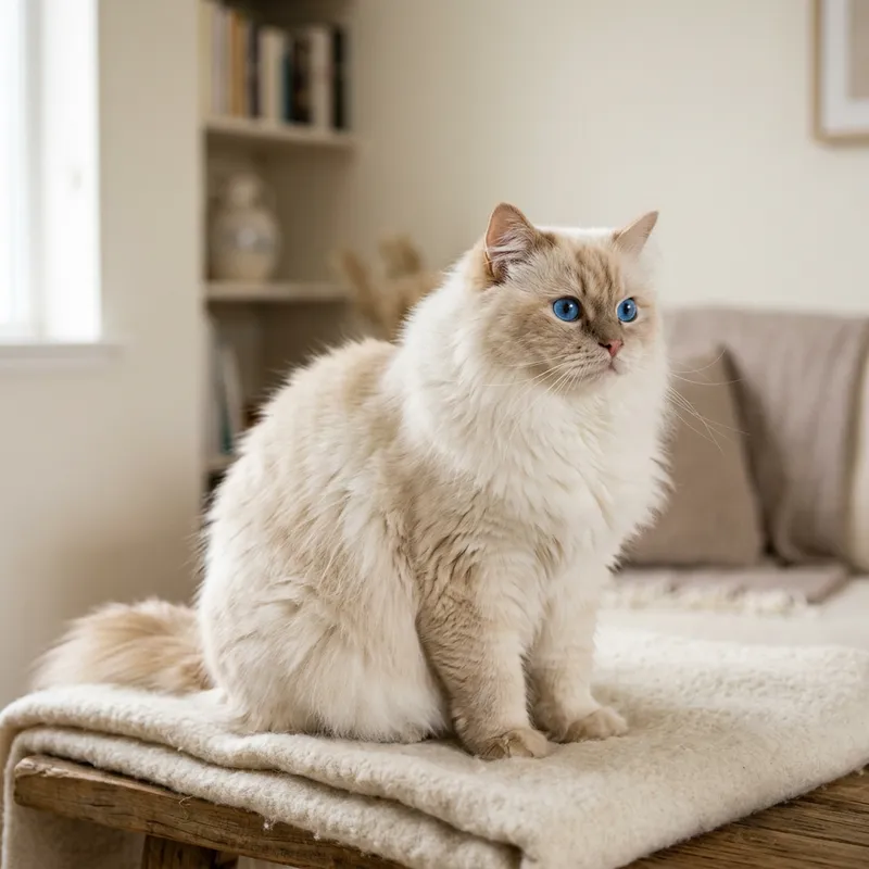 A beautiful Himalayan cat with fluffy white fur tinged with points of cream or light tan, vivid blue eyes peering curiously into the distance. Its body is relaxed, showcasing its overall robust and sizeable physique, hinting at its Siamese and Persian ancestry. The surrounding environment remains neutral, allowing the cat's natural elegance to command attention.