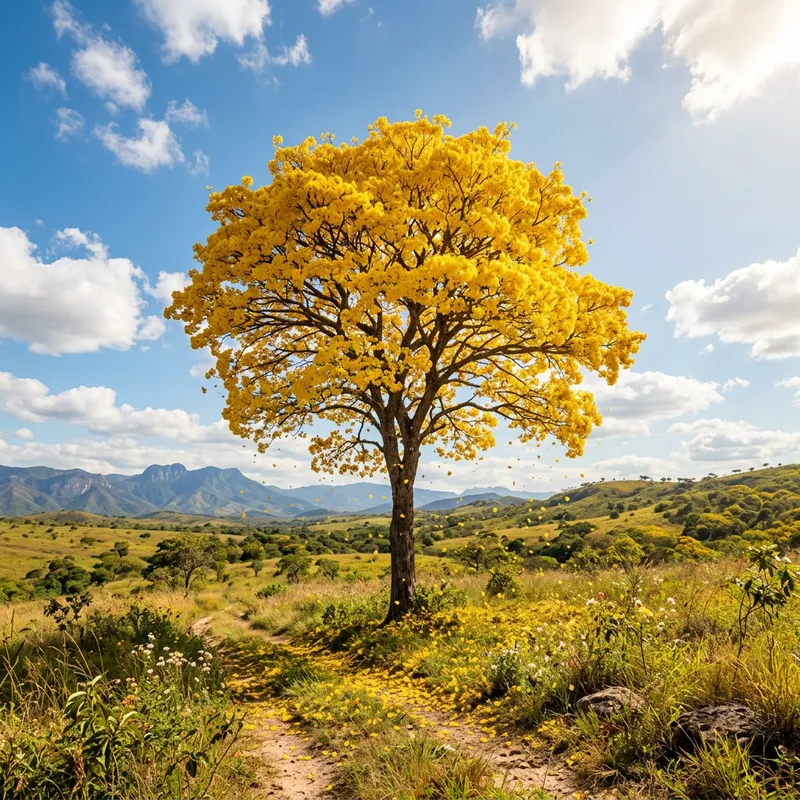 A beautiful landscape dominated by an Araguaney tree. It is an ornamental tree native to the Cerrado savannas of Venezuela. It is daytime, the sun is shining brightly, casting a warm glow on the blue sky. The Araguaney tree stands tall and proud in the center, its yellow flowers in full bloom, creating a stark contrast with the blue sky and the green hues of the grassy fields surrounding it. The scene exudes a feeling of serenity, with occasional gusts of wind causing a golden shower of petals from the tree.