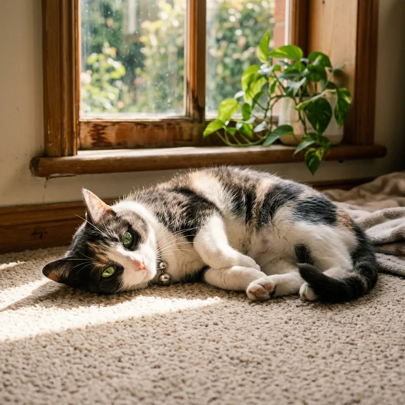 A domestic cat basking in the warm sunlight that's creeping in through the window. Its fur is soft and multicolored, combining shades of black, white, and gray in a patchy pattern. The cat's eyes are brilliantly green, reflecting the sunlight in a mesmerizing way. The feline's body is relaxed, a sign of contentment, as its thin tail lazily swishes from side to side on the soft carpeted floor. Lastly, a silver collar with a small bell is wrapped gently around the cat's neck, jingling softly with each of the cat's movements.