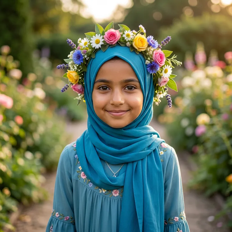 A Muslim girl of Middle-Eastern descent, elegantly dressed in a vibrant headscarf. Her headscarf is richly decorated with a ring of colourful, blooming flowers around her head, casting a lovely glow to her gentle radiant face.