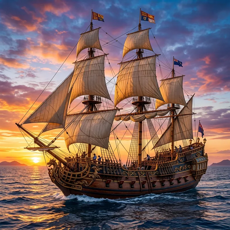 Visualize a majestic beauty of a ship, grandly designed and brilliantly crafted. The ship boasts tall, imposing masts that hold billowing sails, kissed by the wind. Decorative carvings ornate the ship’s body; each a testament to the skill of craftsmen. The ship sails on a gentle sea, under a sky painted with hues of a setting sun. The golden rays hitting the ship give it a surreal glow, further accentuating its structures. Waves gently caress the ship, while the breeze playfully tugs at the sails. It is a testament to mankind's endless quest for exploration and adventure.