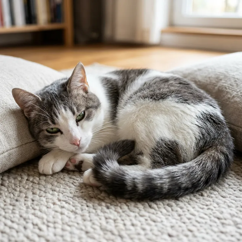 A detailed image of a domestic cat. The cat has short, textured fur, the color a mixed blend of white and patches of gray. It is lying down, possibly after a session of play or hunting. Its mesmerizing green eyes are partially closed in contentment, while the pointed ears are relaxed. The well-groomed whiskers twitch lightly from its button-like pink nose. The tail, lush with fur, wraps around the cat's body in a perfect, comfortable curl. The background is simple and uncluttered, perhaps a cushion or a soft rug, to highlight the cat's natural beauty and elegance.