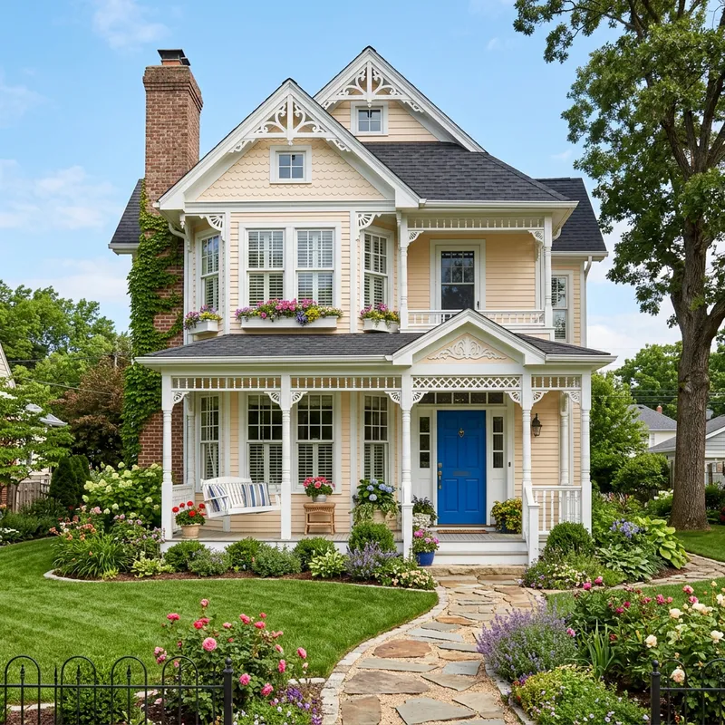A traditional two-story house with a beautifully manicured front lawn. Painted in pastel colors, it stands out boldly against a clear blue sky. There's a small porch with a swinging bench out front. The house is lined with detailed woodwork, displaying intricate patterns and designs. A brick chimney on one side, showing signs of many cozy winters spent inside the house. A stone path leads to a brightly painted front door, which beckons visitors to come inside and experience the welcoming ambiance it promises.