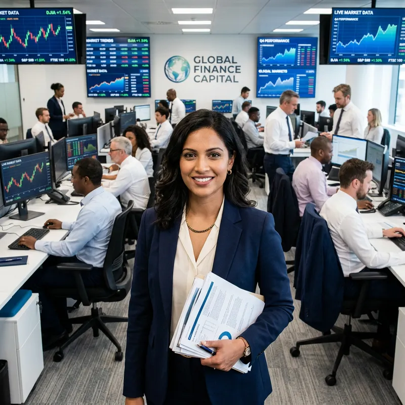 A beautiful woman of unspecified descent standing in front of a backdrop showcasing a financial business company. The background features a corporate office landscape, full of bustling employees of varying descents and genders, immersed in their work. All around, screens showcase dynamic graphs and charts, indicating the real-time financial data updates. The woman is well-dressed, exuding an air of professionalism and confidence, holding a stack of documents and looking directly at the viewer.
