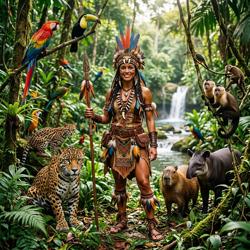 Beautiful Woman in Jungle: Amazon Attire and Wildlife