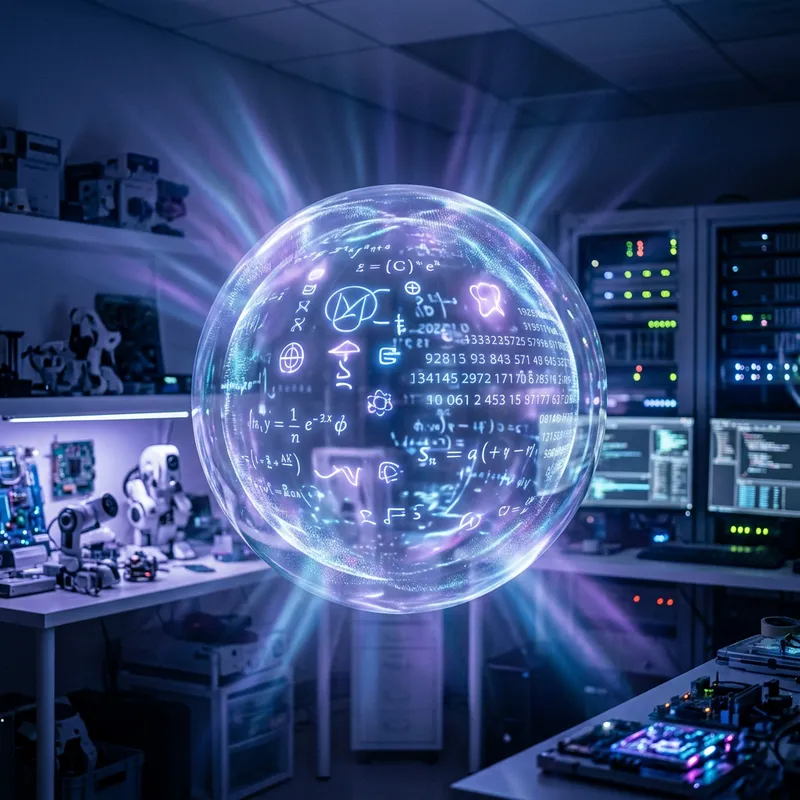 An elegant artificial intelligence system imbued with beauty. Its visual interface is represented by holograms of symbols and numbers with soft glowing edges, appearing ethereal and futuristic. It's encompassed within a semi-transparent sphere, embodying a futuristic vision of advanced technology. The sphere is floating in a dimly lit room filled with high-tech gadgets. Streams of light pulse from the sphere, illuminating the room with a mesmerizing display. The ambient light cast by the AI paints the room in shades of blues and violets, creating an air of serenity and intelligence.