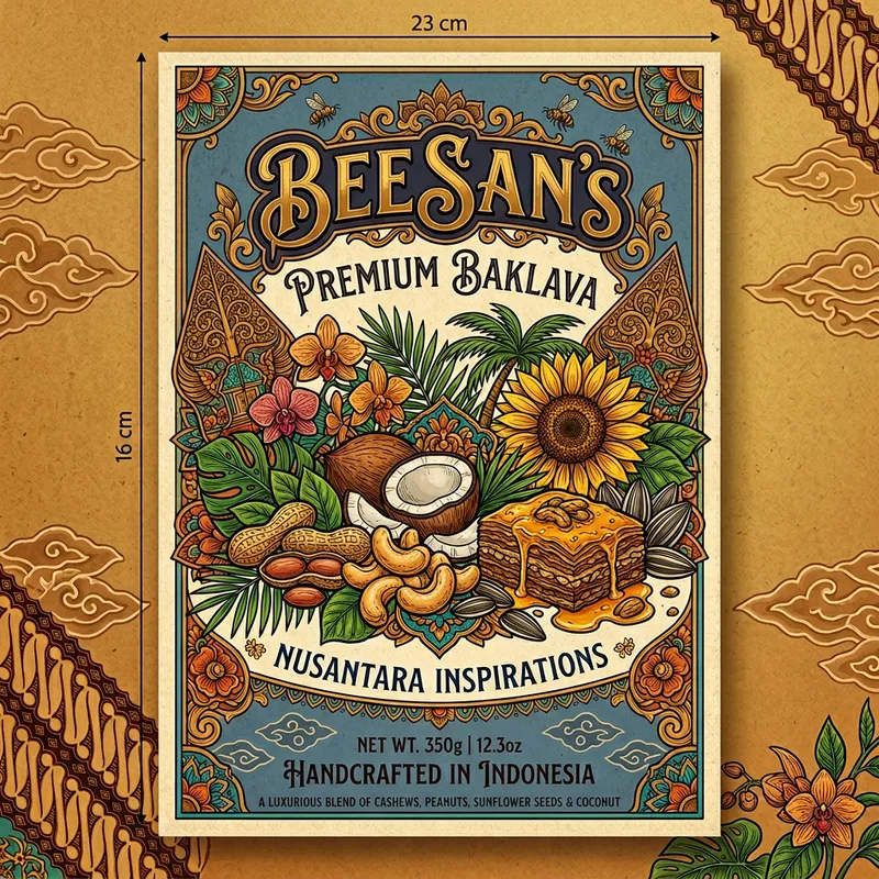 Depict a vibrant, colorful packaging design for 'BEESAN's' premium baklava, inspired by Indonesia's rich cultural heritage. The design should measure 23 cm in width and 16 cm in height and be crafted using contour drawing techniques. The packaging should include detailed depictions of coconuts, peanuts, cashews, and sunflower seeds to emphasize the baklava's flavors. Carefully blend cultural motifs and symbols throughout, and subtly incorporate 'Nusantara Inspirations' in navy font while maintaining adequate negative space for additional elements. Key aesthetics to elaborate are warm, earthy tones and a luxurious feel to signify the product's premium status.