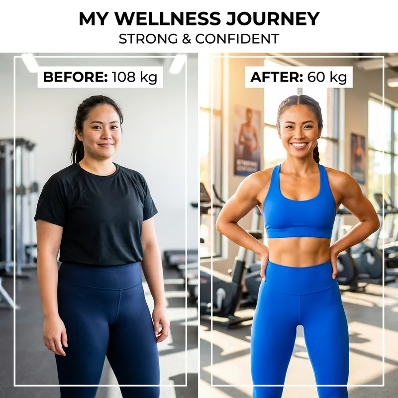 before and after transformation of a 5'3 model, showcasing her journey from 108kg to 60kg, in a motivational and uplifting style with bright, energizing lighting, strong and confident body language, captured in high-resolution portrait photography with vivid colors enhancing the positive atmosphere, health and wellness genre.