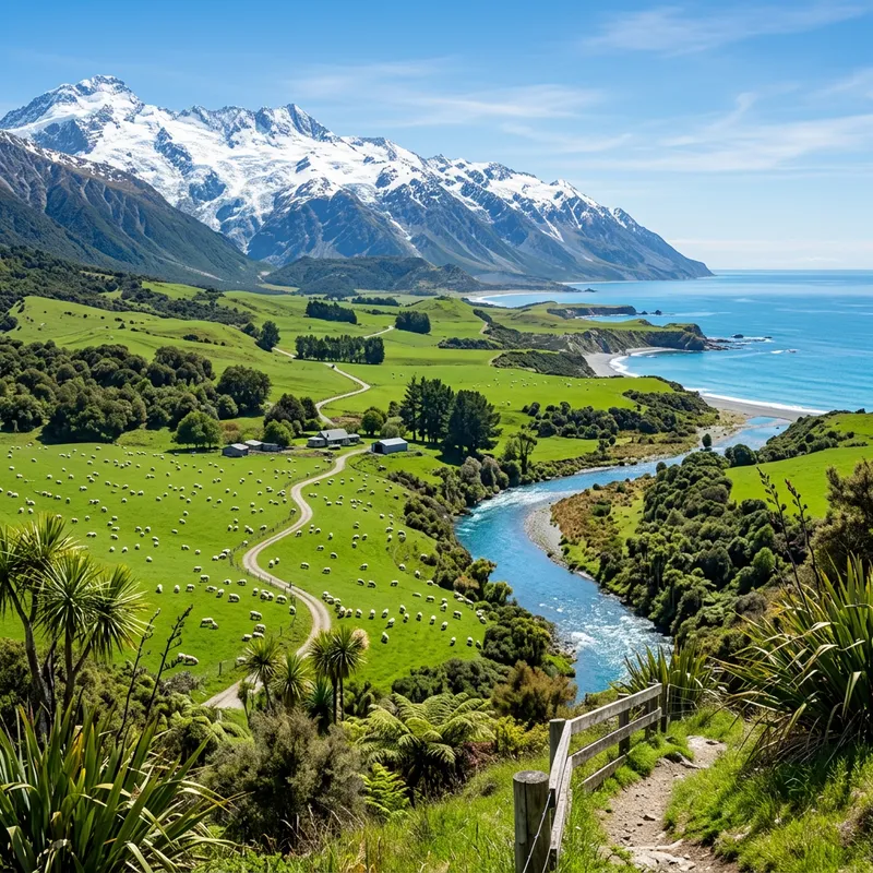 Generate an image of an idyllic location in New Zealand, capturing the beautiful landscapes for which the country is known. The image should include majestic mountains with snow-capped peaks, emerald green fields dotted with sheep, sparkling blue rivers winding through the landscape, a pristine, azure ocean in the distance and beautiful native trees and plants. All elements should blend harmoniously, capturing the tranquility and natural beauty of New Zealand. The quality of the image should be high, revealing intricate details and vibrant colors that truly bring the scene to life.