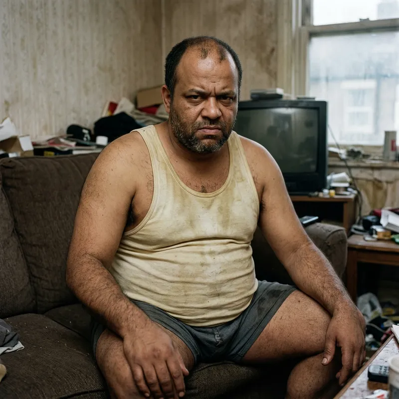((best quality)), ((masterpiece)), (detailed), male, 40 years old, obese, wear wet dirty white yellowish tank top, wear dirty briefs, villain face, balding short hair, short beard, hairy arms, dirty body, rapist, brown skin, dirty place, bushy armpit hair, overweight.