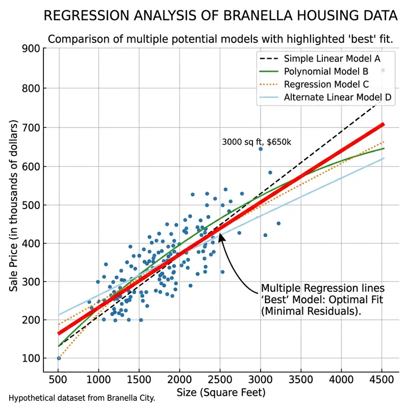 Illustrate a statistical data plot showcasing various regression lines derived from a housing data set of a hypothetical city, Branella. The distinct lines represent various potential models, with the 'best' model labeled and highlighted. This 'best' line should have the optimal fit to the data points, indicating minimal residuals. The data points represent individual housing data entries in the city. Ensure to include relevant features such as axes, labeled data points, and a key or guide to interpret the different regression lines.