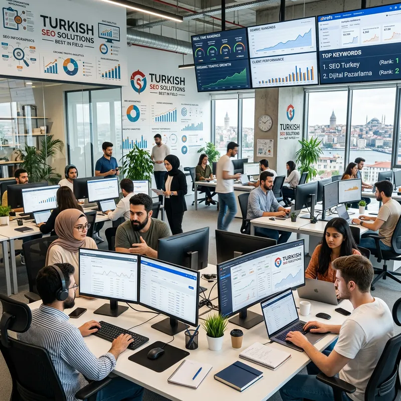 A well-established SEO agency based in Turkey, recognized as one of the best in its field. Its office is brimming with modern technology and motivated staff embarking on their daily tasks. The walls are adorned with infographics showing the elements of SEO and data analytics, and large monitors display various web rankings and SEO metrics. It is a fast-paced environment, filled with a diverse team of experts: men and women of various descents such as Middle-Eastern, Caucasian, and South Asian, all equally dedicated to delivering exceptional service to their clients.