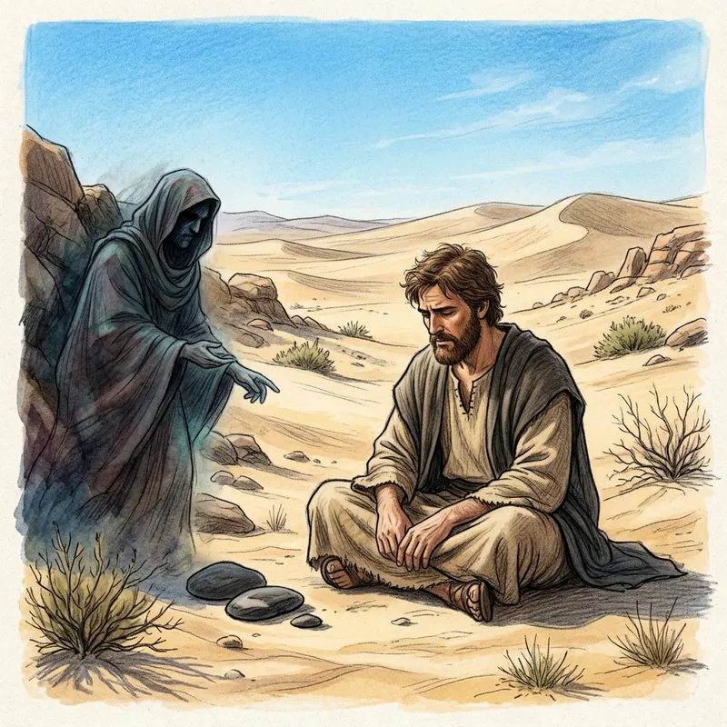 An illustration showcasing the scene of a biblical figure's temptation in the desert. He is depicted as a man with medium skin tone and brown hair, wearing simple, modest attire. The desert around him is vast and sandy, with a clear, blue sky overhead. In front of him appears the source of his temptation, a figure shrouded in shadows and mysterious allure. The whole scene exudes a sense of profound contemplation and spiritual struggle.