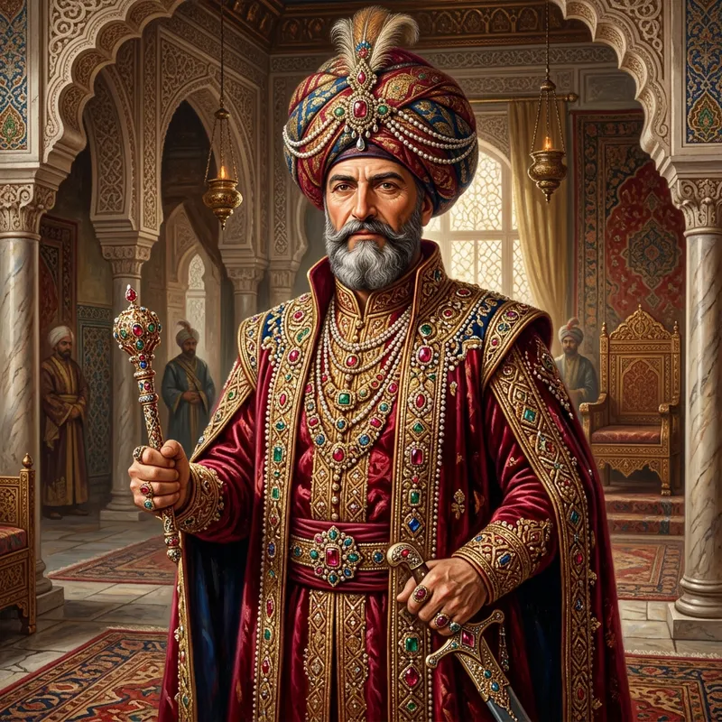 A historical figure dressed in traditional royal attire from the 15th century. He is adorned with a lavishly decorated turban and a bejeweled robe. His facial expressions portray wisdom and valor. The background is an elaborate palace interior. Please note, this should not be a depiction of a specific historical figure, but rather a generalized interpretation.