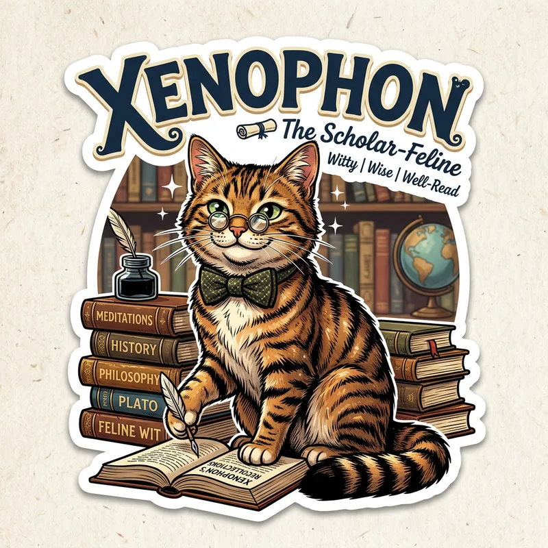 Create a comic-style sticker of a cat with a unique and obscure name. This feline is not just any ordinary cat, but one that portrays a witty and intellectual persona. The cat is in high-definition, showing meticulous detailing in comic-style art with its fur textures, whiskers and sparkling eyes. Give the cat a slight smile to suggest its intelligence and subtle humor. Its overall appearance should mirror similar qualities found in classic comic characters, such as quick wit and a mischievous yet charming nature.