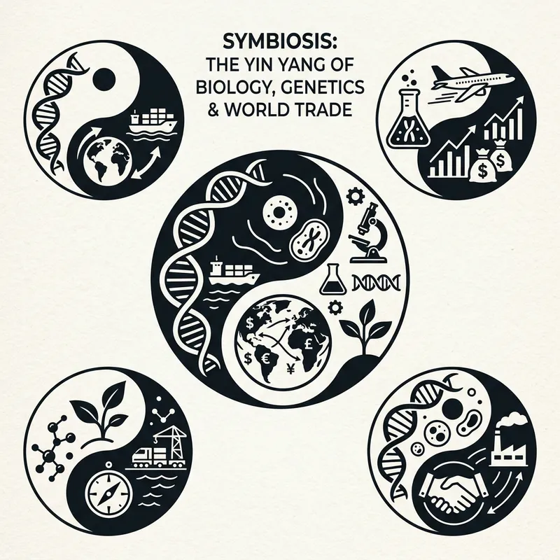 Create a collection of simple designs which heavily incorporate elements of biology and genetics, international business and world trade. These designs should exhibit a yin and yang style, symbolizing the interconnection and balance of these diverse fields. The depiction should convey the essential symbols used in all these fields. Please include double helix DNA strands, globes and icons representing trade, in a continuous rotation expressing the symbiotic relationship between these fields in a unique and minimalistic way, reflecting the Yin and Yang philosophy.