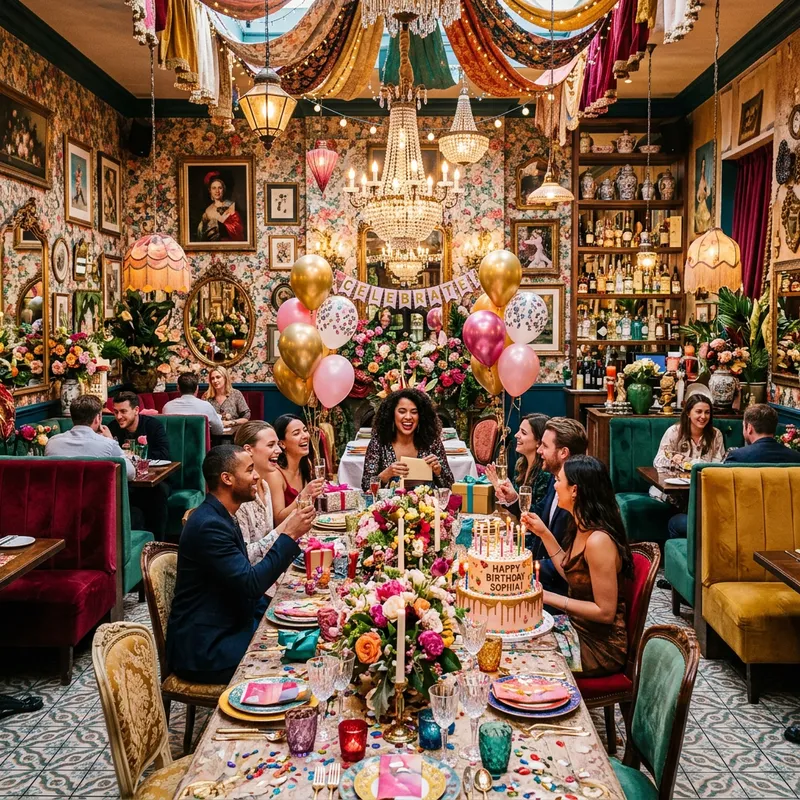 Beautiful Maximalist Restaurant, Birthday place, interior design photography, high quality.