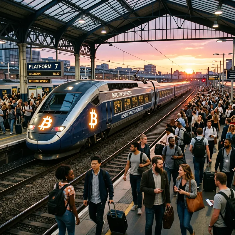 A train stationed at a platform with the Bitcoin symbol prominently displayed on its exterior. The station is bustling with passengers of all descents and genders awaiting their respective journeys. The evening sunset glows in the background, casting long shadows on the tracks and adding a soft light to the surroundings. The train, a sleek and modern marvel, is a symbol of technological innovation reflecting the decentralized nature of the cryptocurrency it carries the logo of.