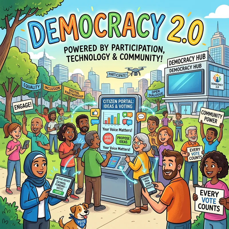 Please create a colorful cartoon about the term 'Democracy 2.0'.
