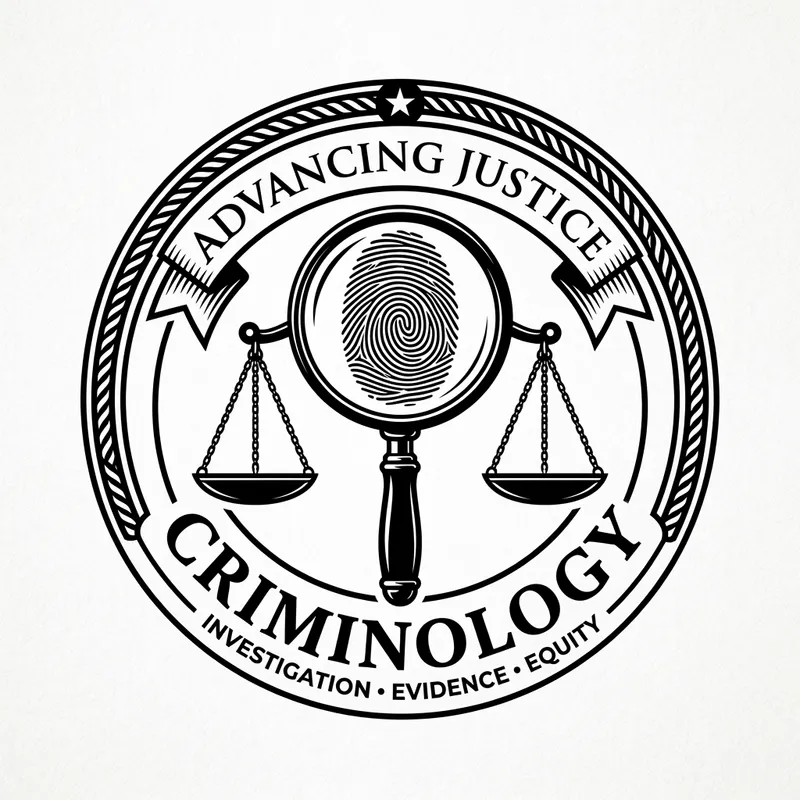Black and white criminology logo featuring a magnifying glass, fingerprint, and scales of justice.