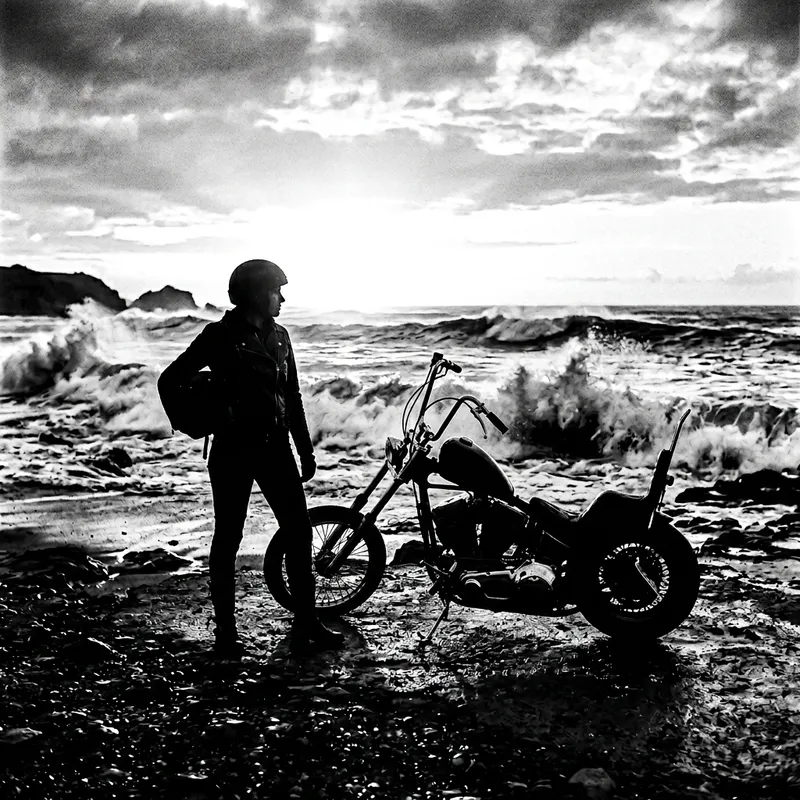 Black and white silhouette. Biker lady and chopper type motorcycle. Waves.