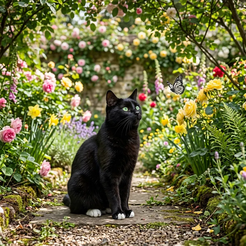A domestic short-haired cat with a shiny coat of black fur, emerald-green eyes gleaming with curiosity, and dainty white paws, sitting in a serene garden surrounded by vibrant blooming flowers such as roses and daffodils. As the sunlight filters through the foliage, creating a play of light and shadow, the cat seems to be keenly observing a fluttering butterfly with a matching color palette of black and white.