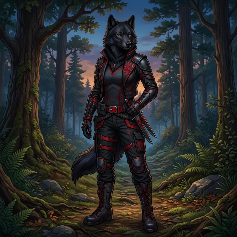 A black female wolf character with anthropomorphic characteristics, dressed in a striking outfit of black and red clothes. Her dark fur is sleek, making her appear intelligent and alert. The wolf's attire, stylish and fierce, adds to her mysterious aura. Her clothing is predominantly black, with bold accents of red that could be interpreted as an insignia or pattern, creating a stunning contrast. This character stands with a confident posture in a tranquil forest setting, under the tranquil twilight sky.